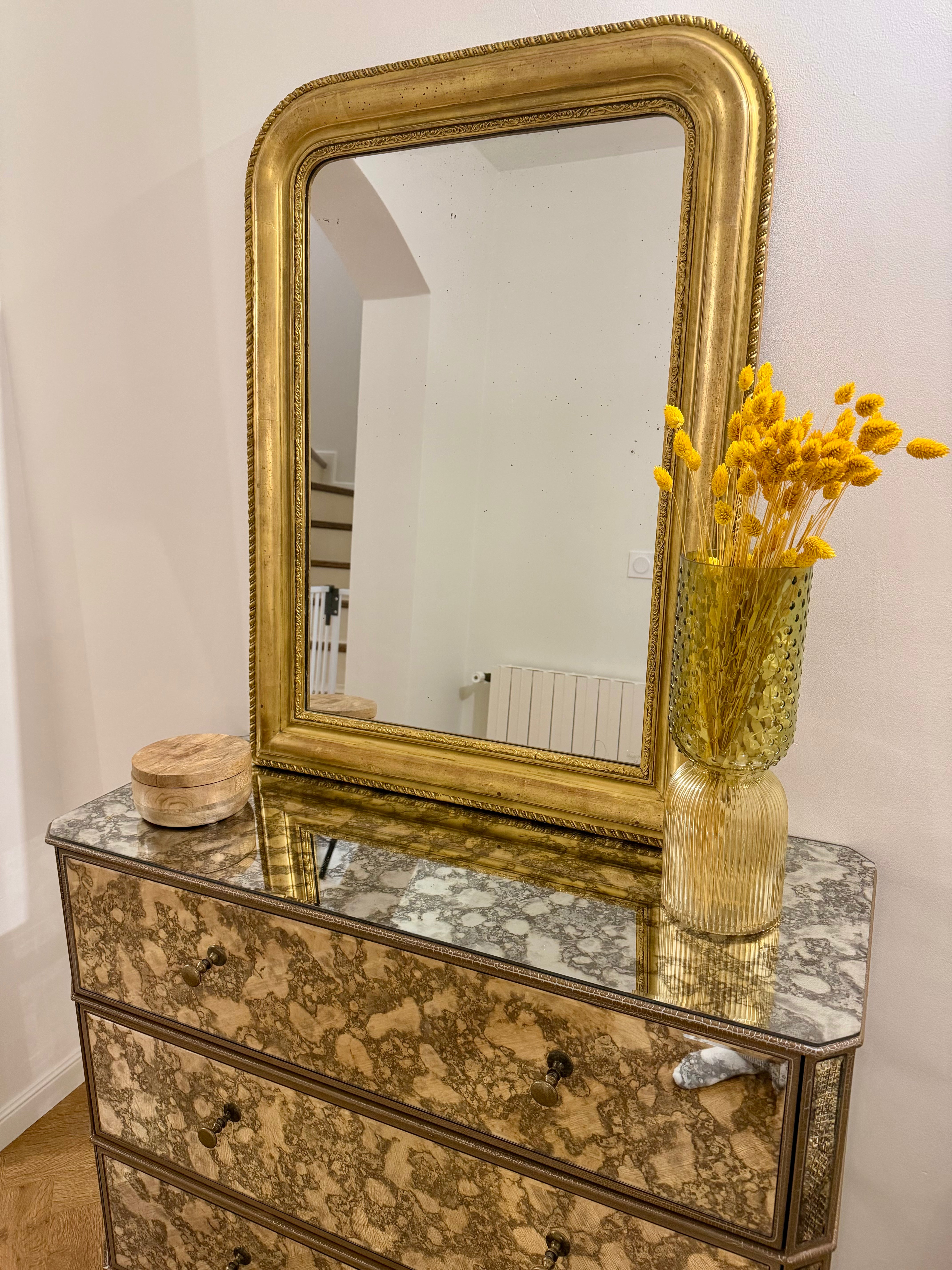 Ce miroir Louis-Philippe à la dorure étincelante est prêt pour sa nouvelle vie en Corse à coté d'un joli bouquet de fleurs séchés.